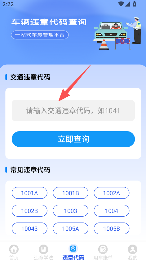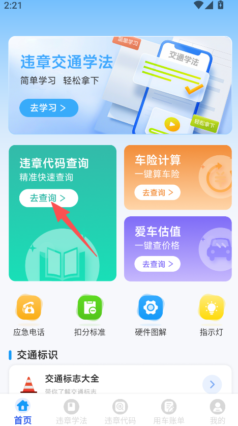 1、打开软件,点击违章代码查询板块,进入查询页面。
