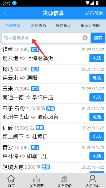 2、在搜索框输入你想运输的货物名称,就像为雷达输入目标坐标,系统立刻为你扫描匹配的运输需求。