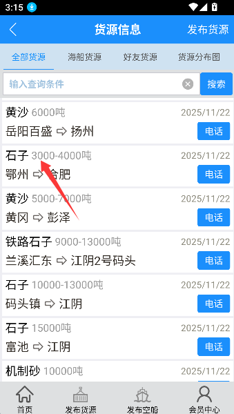 3、从搜索结果里选中心仪的货盘,直接点击联系按钮,电话接通那刻仿佛听见货轮鸣笛般令人振奋。