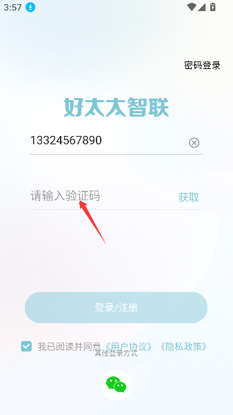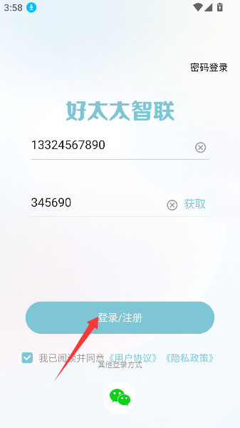 3、最后勾选隐私政策的小方框,再点击登录按钮,就像和智能家电握手表决通过,正式获得管理权限。