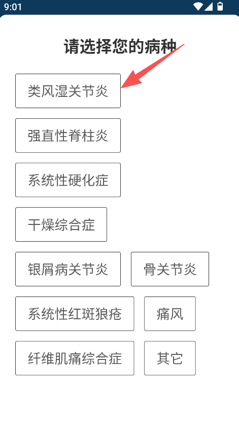 1、病种分类清晰明确,涵盖类风湿关节炎等多种常见风湿类疾病,选择对应病种即可进入相关内容页面,减少知识查找的冗余步骤。