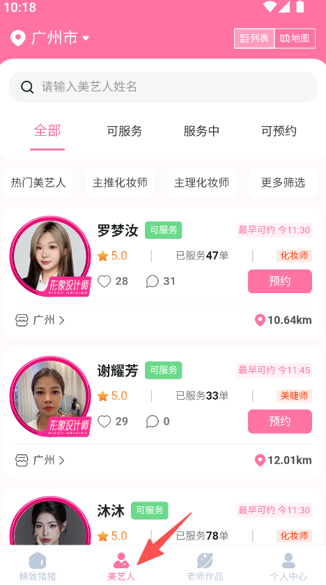 1、美艺人分类清晰,按化妆师、美睫师等类型区分,结合接单量、评分等数据,能快速筛选出适配的美艺人,提升预约效率。