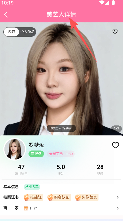 3、展示美艺人详细信息,包含作品展示、从业年限、档案证书等内容,让美艺人的专业背景更透明,提升服务预约的可信度。