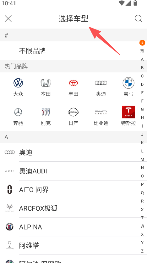 2、进入选择车型页面,挑选目标品牌车型。