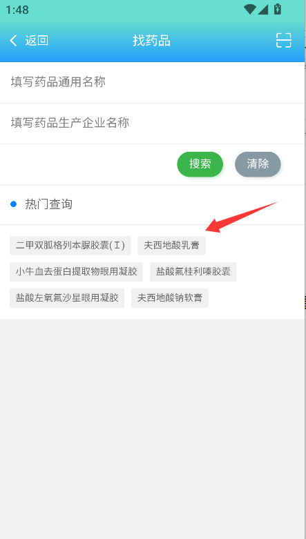 2、选择“热门查询”栏目中预设的常用药品名称,也可在搜索框内手动填写药品的准确通用名称。