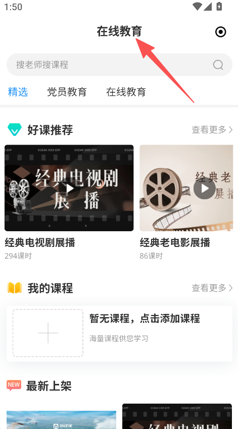 1、打开软件进入在线教育板块,浏览课程推荐。