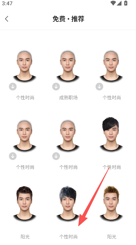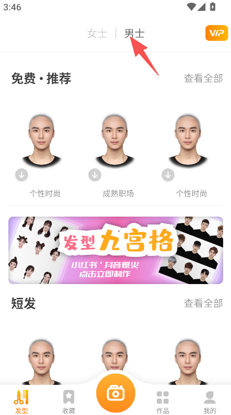 1、打开软件选择男士或女士分类,浏览免费推荐发型。