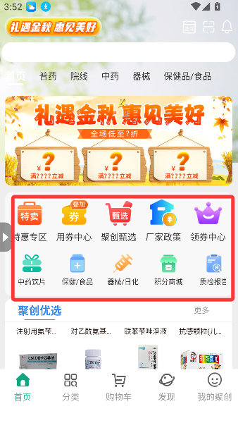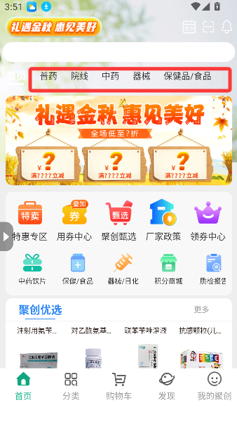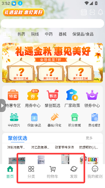 1、首页顶部陈列着普药、院线、中药等导航罗盘,如同药材库的三大主展区静候检阅。