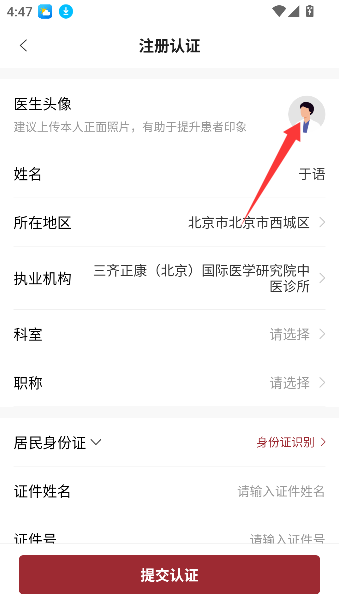 2、上传一张清晰的本人照片,就像在诊室门口挂上那块印有姓名和职称的醒目名牌。