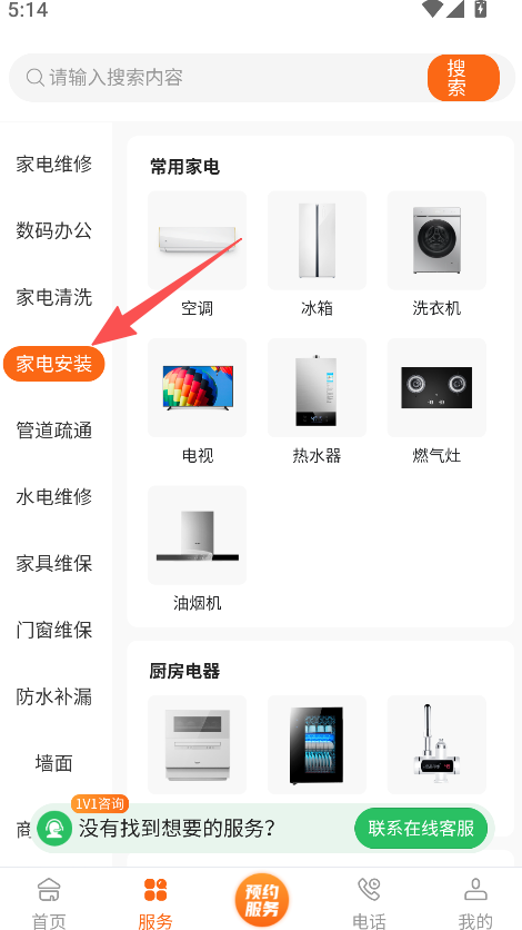 2、在服务分类中,选定具体服务类型,如电视安装。