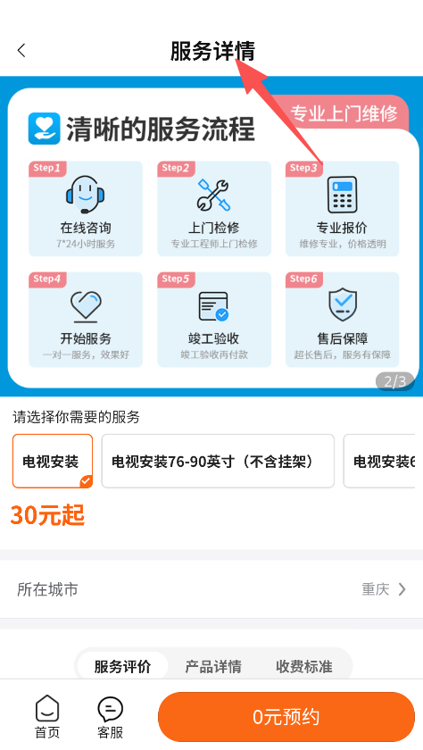 3、包含服务详情查看功能,可了解具体服务的流程、收费标准等信息,如电视安装的相关说明,帮助明确服务内容与细节。
