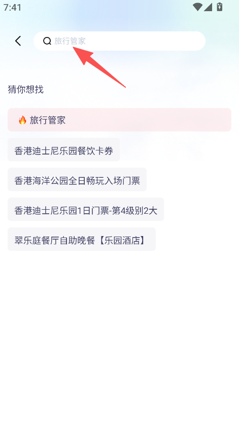 1、具备搜索功能,在搜索栏输入关键词可查找对应的旅行相关内容,如旅行管家及各类票务信息,帮助获取所需的旅行资源。