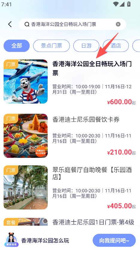 1、支持关键词搜索功能,输入内容可查找旅行相关信息,展示对应票务,如香港迪士尼餐饮券、香港海洋公园门票等,覆盖不同旅行场景的票务需求。