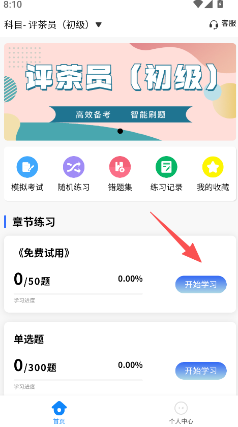 2、支持章节练习功能,在章节练习板块下设置免费试用及不同题型练习入口,点击开始学习即可进入答题页面,开展对应内容的练习。