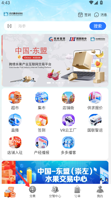 1、于底部导航栏找到并点击"分类"选项,即可进入全部商品分类页面。