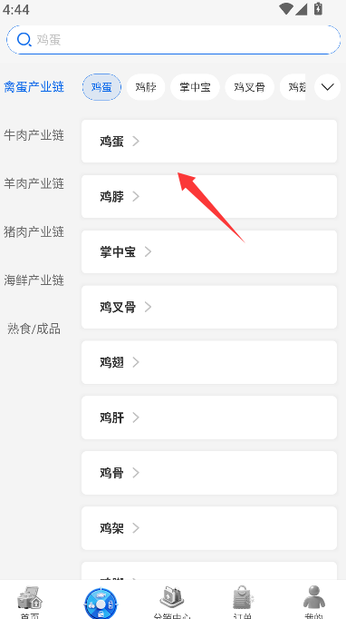 2、找到并点击"禽蛋产业链"分类,随后选择其下的"鸡蛋"子选项,页面将展示所有鸡蛋相关商品列表。