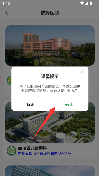 2、允许软件获取您的位置,这位贴心的“导航员”将为您精准锁定最近、最合适的医院选项。