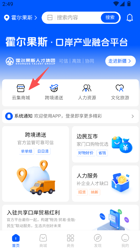 1、具备云集商城功能,首页设对应入口,点击即可进入商城页面,获取口岸相关的商品展示与消费服务,是进入商品板块的核心操作入口。