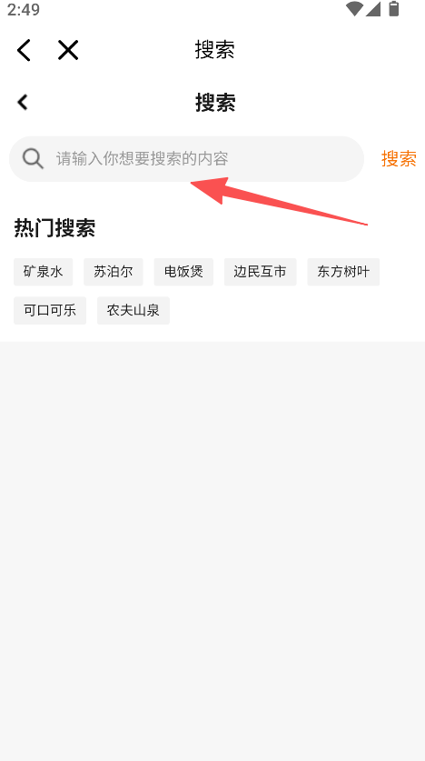 3、热门搜索实用辅助,展示矿泉水等高频搜索关键词,无需手动输入即可选择对应内容,进一步简化商品查找的流程。