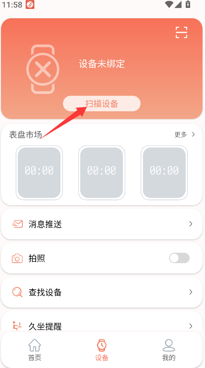 2、点击位于页面中的“扫描设备”按钮,应用程序将开始搜索周围可用的智能设备。