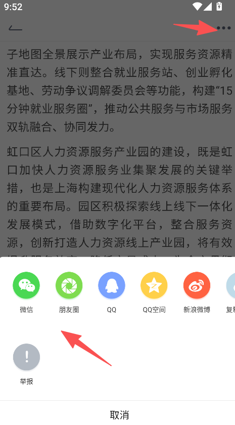3、具备资讯分享功能,在资讯详情页点击更多,选择微信、朋友圈等渠道,完成资讯内容的分享操作,实现资讯的传播。