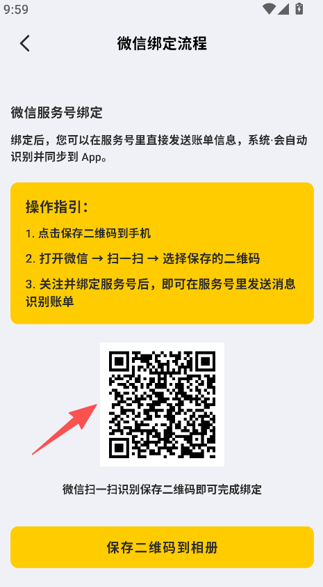 3、绑定流程设计清晰,通过保存二维码+微信扫码的方式完成服务号绑定,操作步骤明确且有详细指引。