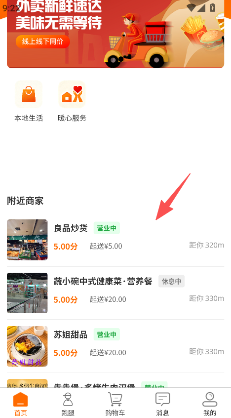 1、打开软件,点击附近商家,查看商家列表。