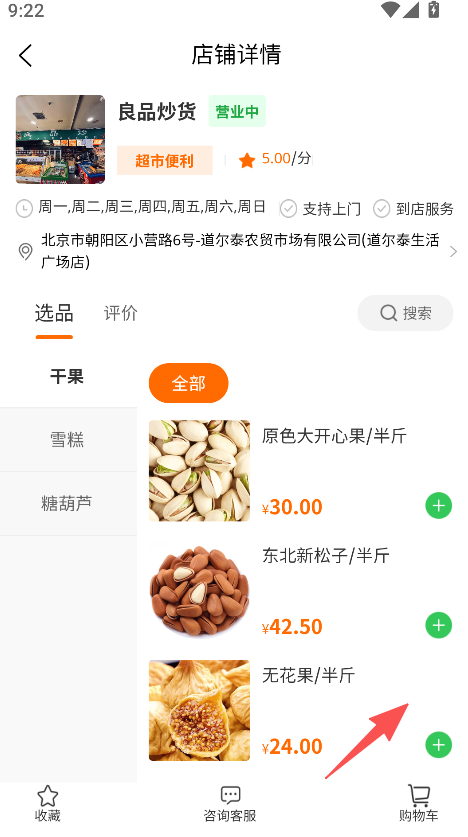 2、店铺详情页整合多类功能,涵盖商品分类查看、购物车添加及店铺收藏,功能衔接适配消费全流程,从选店到选购的操作链路顺畅且高效。