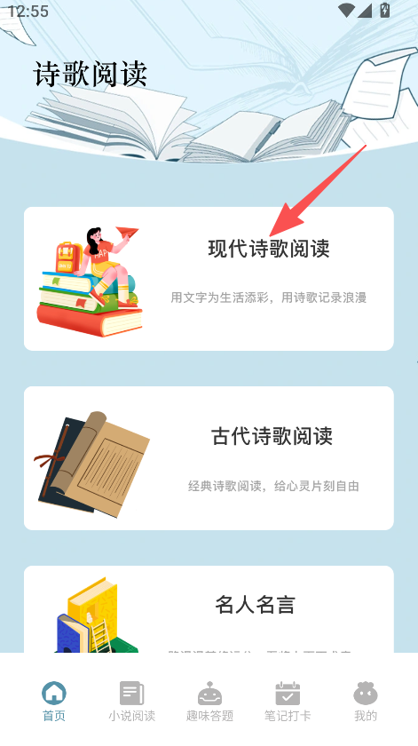 1、按诗歌类型划分阅读板块,含现代诗歌阅读古代诗歌阅读名人名言等,各板块匹配对应内容风格,适配不同诗歌阅读偏好的需求。