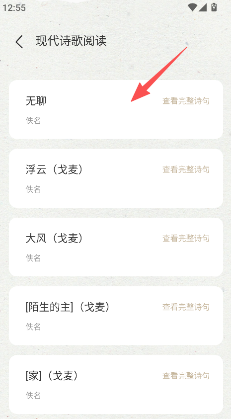 2、作品展示分列表与全文两种形式,列表呈现作品名称,点击后可查看完整诗句,让诗歌阅读既便于筛选又能深入浏览内容。
