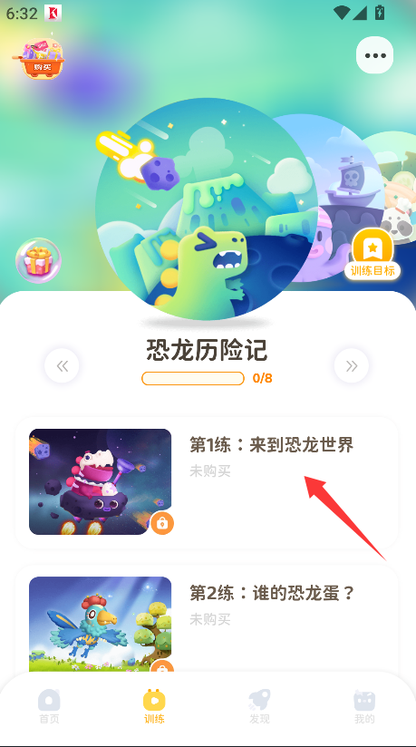 2、浏览并选择诸如“恐龙历险记”等主题训练课程,点击该课程卡片即可进入其具体的训练内容介绍与准备界面。