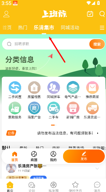 2、点击进入“乐青集市”板块,查看分类信息入口及最新发布的物品或服务。