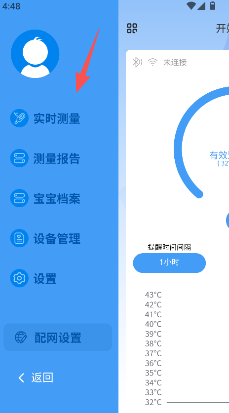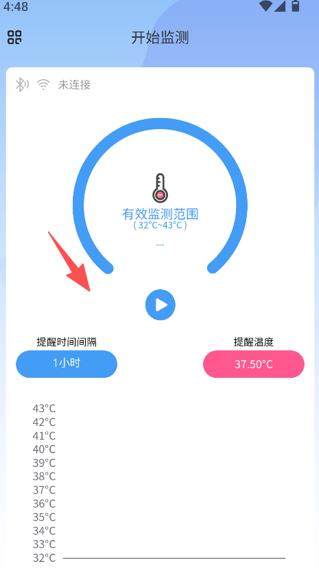 2、支持体温监测功能,进入开始监测页面,查看32℃-43℃的有效监测范围,设置提醒时间间隔与提醒温度,启动监测流程。