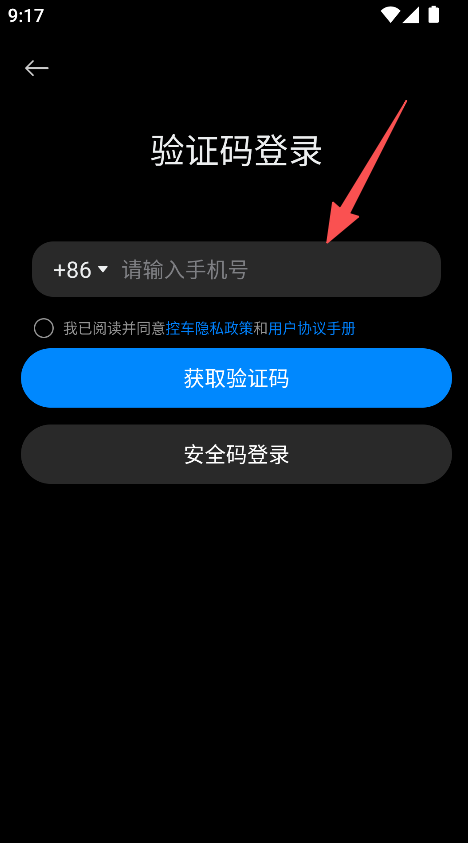 1、打开汽车指挥,选择手机号及验证码登录方式,输入对应手机号。