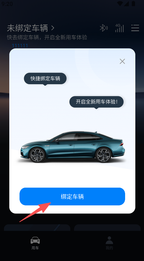 3、点击提示框中的绑定车辆按钮,即可完成车辆绑定开启用车体验。