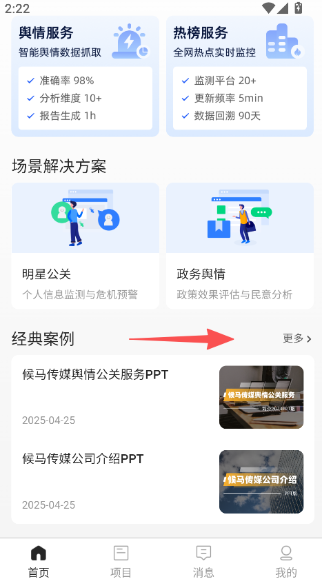《口袋公关》是一款舆情公关服务类软件,舆情服务支持高准确率数据抓取,热榜服务可实时监控多平台热点,设明星公关、政务舆情等场景方案,经典案例板块展示相关PPT,点击可预览资料,辅助获取公关服务资源。