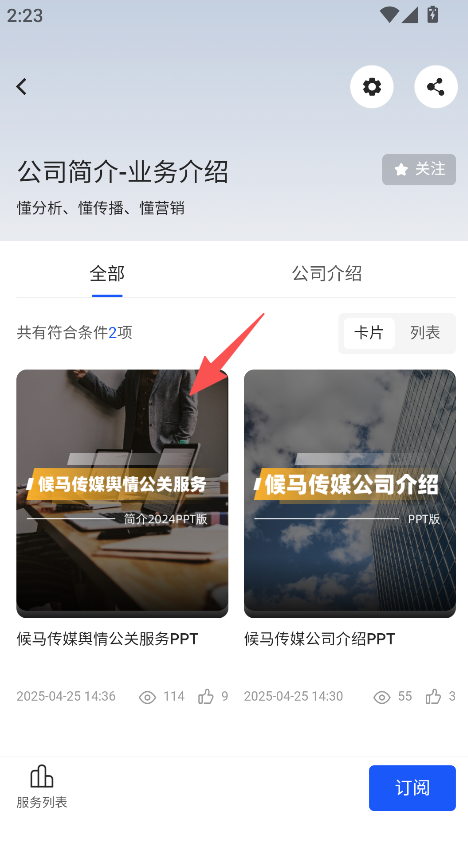 2、进入公司简介页面,选择目标公关服务PPT。