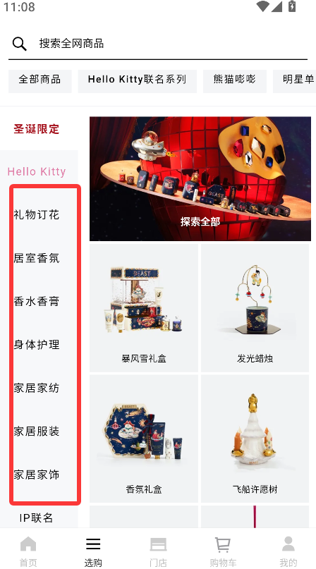 2、根据个人需求浏览或通过分类筛选目标商品,如选择花艺、家居、香氛等具体品类。