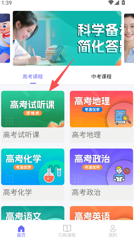 1、打开软件进入首页,选择高考课程板块下的高考试听课。