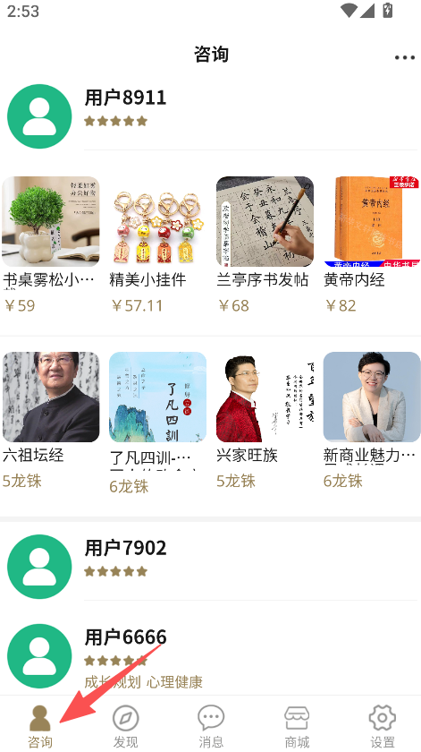 1、打开软件进入咨询页面,浏览展示的商品与课程。