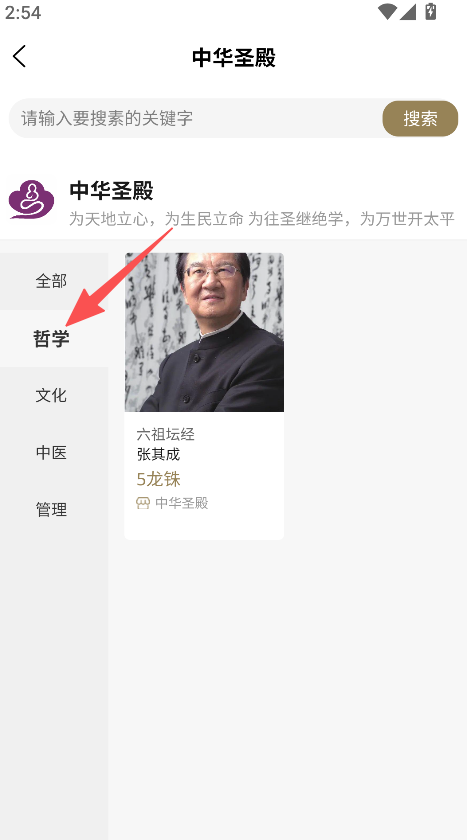 2、选择发现板块,进入中华圣殿页面选择哲学分类。