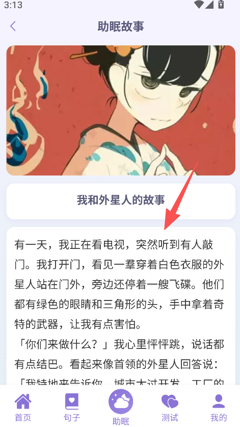 2、助眠故事搭配配图呈现,句子板块支持互动操作,丰富内容的呈现形式与使用体验。