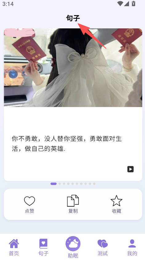2、设句子板块呈现励志内容,支持点赞、复制、收藏,辅助获取与留存正能量内容。