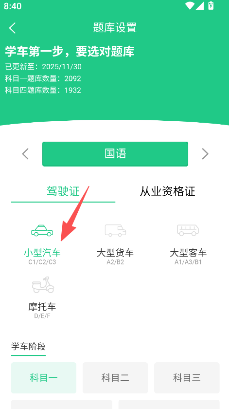 1、提供题库设置功能,进入对应板块,可选择小型汽车等车型匹配对应的驾考题库。