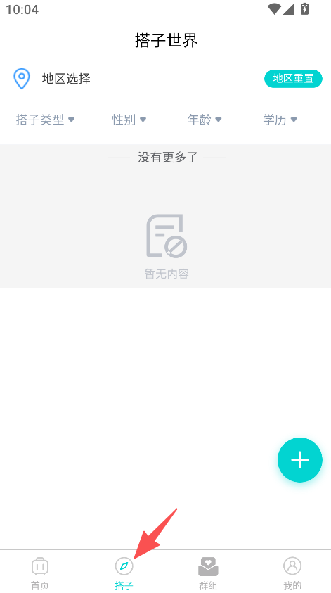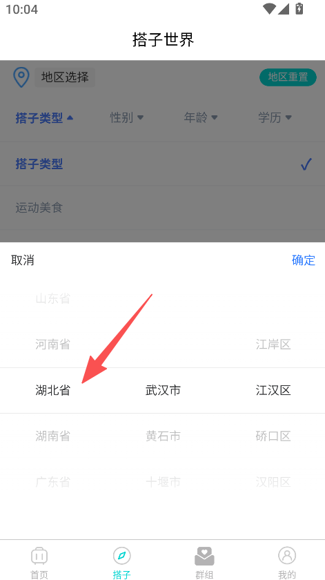 1、提供地区选择功能,在搭子板块,可选择省市区层级的对应地区缩小匹配范围。