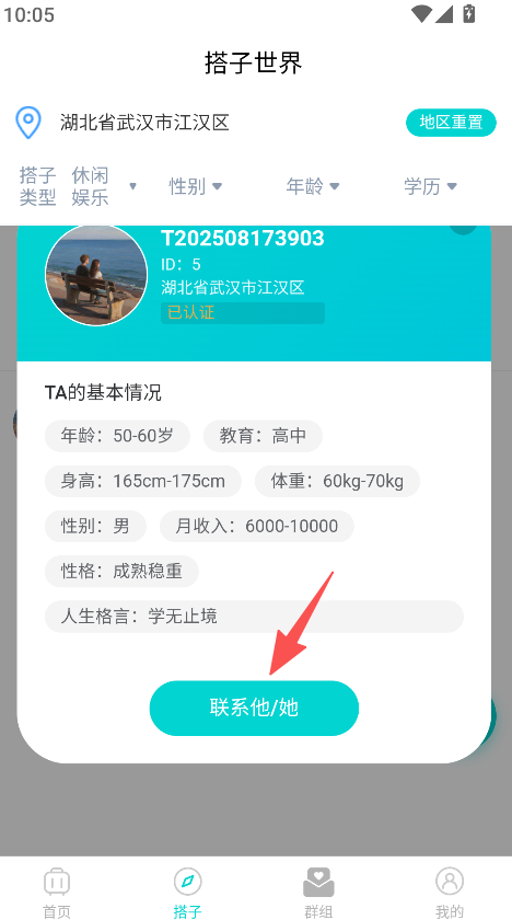 3、具备搭子联系功能,找到匹配搭子后,点击联系按钮发起与搭子的互动交流。