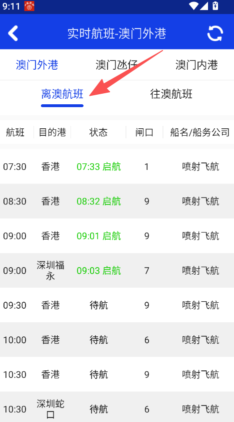 1、提供实时航班查看功能,点击对应选项,可查看澳门外港等港口的离澳/往澳航班信息。