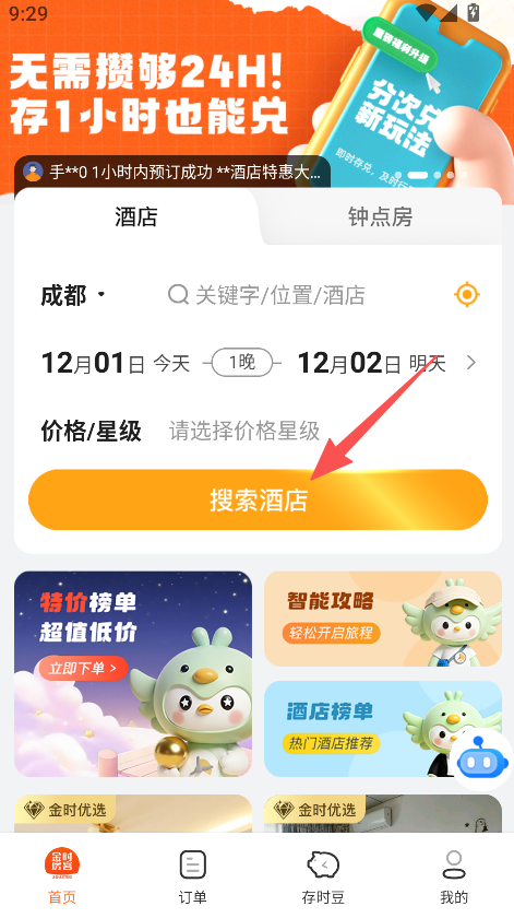 1、聚焦酒店预订服务,支持酒店及钟点房双选项,设存时兑换优惠,存1小时也能兑,适配短时住宿的订房需求。