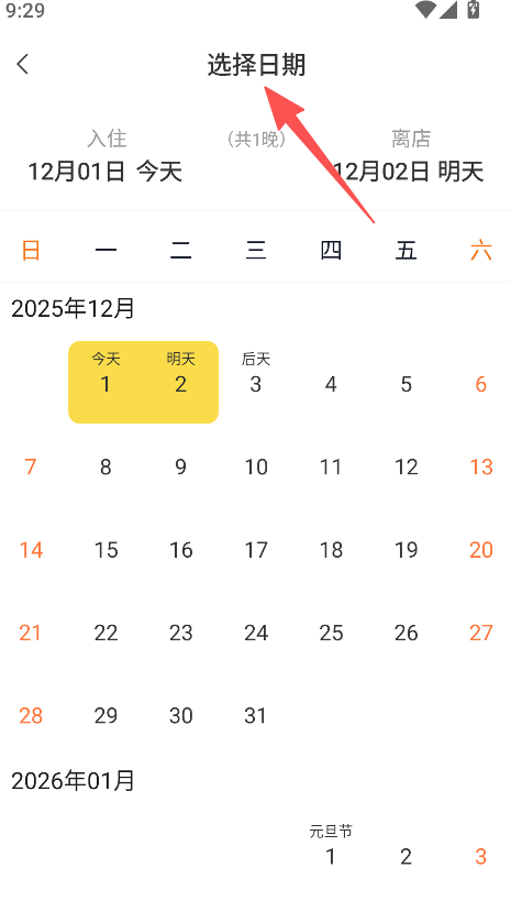 1、提供日期选择功能,进入对应页面,可挑选入住离店日期确定住宿的时段。