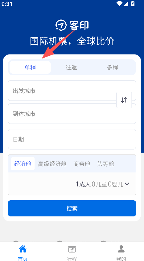 1、提供行程类型选择功能,进入软件后,可挑选单程往返多程的对应行程类型。
